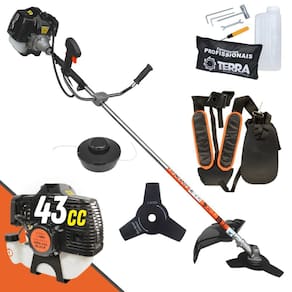 Roçadeira Lateral Terra GRH-430 Black À Gasolina 2 Tempos 43cc 1,7HP??MARCA TERRA - A ROÇADEIRA MAIS VENDIDA DO BRASIL??MELHOR CUSTO BENEFÍCIO DO MERCADO?ROÇADEIRA POTENTE E ECONÔMICA ?ALTA ROTAÇÃO E PERFORMANCE COM ECONOMIA?ASSISTÊNCIA TÉCNICA EM TODO TERRITÓRIO NACIONAL?PRODUTO COM GARANTIA OFICIAL TERRA EM TODO BRASIL?PEÇAS DE REPOSIÇÃO DE FÁCIL ACESSO??EQUIPE DE PÓS-VENDAS A DISPOSIÇÃO??A Roçadeira GRH-430 Black conta com motor 2 tempos à gasolina, 43 cilindradas e potência de 1,7 HP. Possui partida leve, com sistema manual, auto-retrátil, e com punhos ergonômicos de fácil aceleração, equipada com carburador universal BIGDINT de maior potência e economia, e também cinto de sustentação duplo com ombreiras almofadadas, proporcionando assim um maior conforto, ergonomia e segurança ao operador.??A Roçadeira Terra GRH430 foi projetada para facilitar o trabalho de roçada de capim, arbustos, pastagens, controle de pastos, trabalhos de jardinagem, limpeza e manutenção de grandes áreas verdes com sua utilização em sítios; fazendas e chácaras. Ideal também para manutenção e limpeza de vias públicas e rodovias. Desenvolvida com uma estrutura resistente e suporte do guidão reforçado, seus componentes possuem alta durabilidade. A vantagem da roçadeira é que pode ser utilizada em locais irregulares, morros, buracos, florestas, entre outro com dificuldade de acesso. Produto de alta qualidade, desempenho e durabilidade.??Operador, instrução recomendada para a utilização da máquina: Verifique a montagem e estado dos componentes da roçadeira; Assegure-se de estar utilizando todos os equipamentos de segurança; Leia o manual para saber como dar a partida em uma roçadeira; Segure a roçadeira com ambas as mãos durante a operação; Mantenha todas as partes de seu corpo longe da roçadeira durante sua operação; Sempre desligue o motor da roçadeira antes de deixá-la desassistida; Transporte sempre a roçadeira com o motor desligado; Proceda com a manutenção e limpeza da roçadeira. Há cuidados básicos que devem ser levados em conta para prolongar a vida útil de cada equipamento, dessa forma, além de manter o bom funcionamento você pode prevenir futuras falhas. Lembrando que se não cumprir as instruções de segurança pode resultar em lesões graves.??ESPECIFICAÇÕES TÉCNICAS:??Tipo: Roçadeira lateral, com guidão?Cód: 705486B?Modelo: GRH430 Black?Marca: Terra ?Motor: À Gasolina, 2 tempos ?Potência: 1,67HP (1,7HP)?Cilindradas: 42,7 (43cc)?Rotação: 6.500RPM?Ignição: Eletrônica?Partida: Manual Auto-retrátil?Carburador: Diafragma com Regulagem?Embreagem: Centrifuga em alumínio fundido?Capacidade do tanque de combustível: 1200ml?Autonomia: Aprox. 60min?Eixo Cardã: Eixo Rígido de 8mm x 9 estrias ?Tubo do Eixo Cardã: Tubo de Alumínio 26mm - 153cm?Guidão: Bi-Partido fixado com suportes parafusados?Lâmina: 3 Pontas, 255mm, espessura 2mm, furo 1"?Combustível: Gasolina com óleo 2 tempos, proporção 25:1?Carretel Nylon: Automático, libera o fio com um toque no chão?Peso: 9,50 kg??ITENS INCLUSOS:??01: Roçadeira GRH430;?01: Carretel com Nylon; ?01: Lâmina 3 pontas; ?01: Cinto Duplo com Ombreiras Almofadadas;?01: Misturador de combustível;?01: Kit ferramentas de manutenção; ?01: Manual de Instrução;