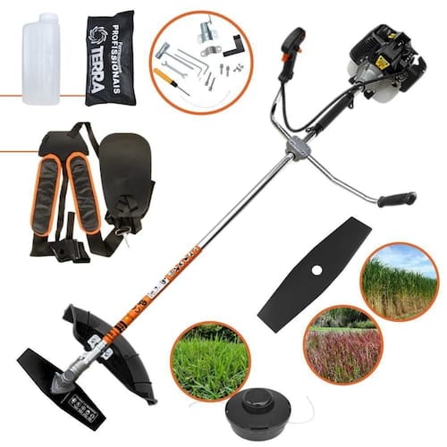 Marca: Terra | Com sistema antivibração: Não | Modelo: GRH520 | Motivo de GTIN vazio: O produto é um kit ou pack | Capacidade do tanque de óleo: N/A | Tipo de guiador: Aberto | Fonte do produto: N/A | Com regulação de guiador: Sim | Sistema de partida: Manual | Comprimento total: 180cm | Com guarda de : Sim | MPN: 84678900 | Capacidade do tanque de combustível: 1,2L | Diâmetro de corte do disco de corte: 255mm | Largura total: 40cm | Tempos do motor: 2 | Eixo de transmissão: Reto | Peso: 11kg | Tipos de máquinas: Roçadeira | Potência do motor: 2,5HP | Cilindrada: 52cc | Tipo de eixo da máquina: Reto | Diâmetro de corte da tanza: 255mm | Sistemas de corte: Faca e Carretel de Nylon | SKU: GRH520 | Acessórios incluídos: Kit ferramentas, cinto de , misturador de combustível | Condição do item: | É kit: Não | Código universal de produto: 7908311802173