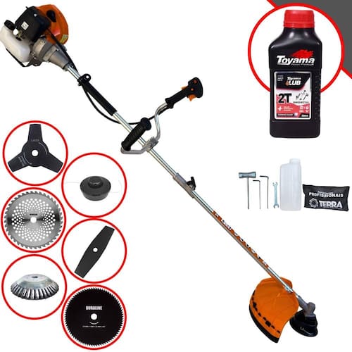 Roçadeira Lateral Terra GRHB-430 Bipartida À Gasolina 2 Tempos 43cc 1,7HP + Faca 3 Pontas + Faca 40 Pontas + Faca 80 Pontas + Escova Rotativa 38 Cerdas + ÓLEO TOYAMA LUB FG50 500ml 2T