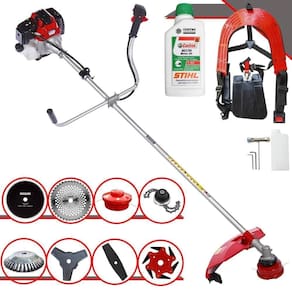 Roçadeira Profissional À Gasolina Toyama RT43L 43cc 1,7HP 2T Com Lâmina 3 Pontas + Faca 2 Pontas 330mm + Faca 40 Dentes 255mm + Faca 80 Dentes 255mm + Faca 6 Pontas 250mm + Trimmer + Escova Rotativa 200mm 38 Cerdas + Óleo Castrol Stihl 500ml