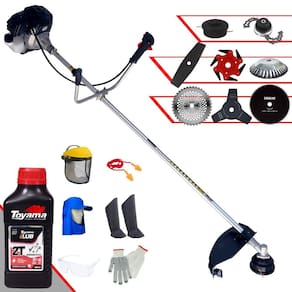Roçadeira À Gasolina Toyama RT43L-B-25A 43cc 1,7HP 2T Com Lâmina 3 Pontas + Faca 2 Pontas 330mm + Faca 40 Dentes 255mm + Faca 80 Dentes 255mm + Faca 6 Pontas 250mm + Trimmer + Escova Rotativa 200mm 38 Cerdas + Óleo Toyama FG50 500ml + Kit EPI Completo