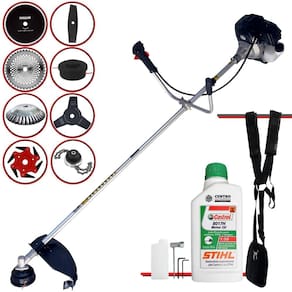 Roçadeira À Gasolina Toyama RT43L-B-25A 43cc 1,7HP 2T Com Lâmina 3 Pontas + Faca 2 Pontas 330mm + Faca 40 Dentes 255mm + Faca 80 Dentes 255mm + Faca 6 Pontas 250mm + Trimmer + Escova Rotativa 200mm 38 Cerdas + Óleo Castrol Stihl 500ml