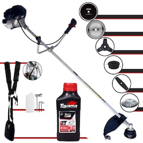 Roçadeira À Gasolina Toyama RT43L-B-25A 43cc 1,7HP 2T Com Lâmina 3 Pontas + Faca 2 Pontas 330mm + Faca 40 Dentes 255mm + Faca 80 Dentes 255mm + Escova Rotativa 38 Cerdas + Óleo Toyama FG50 500ml
