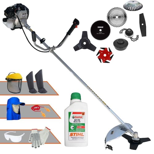 Roçadeira À Gasolina Toyama TBC43H 42,7cc 1,7HP 12.000rpm 2T + Faca 2 Pontas + Faca 40 Dentes + Faca 80 Dentes + Faca 6 Pontas + Trimmer + Escova 38 Cerdas + Óleo Stihl + Kit EPI Completo