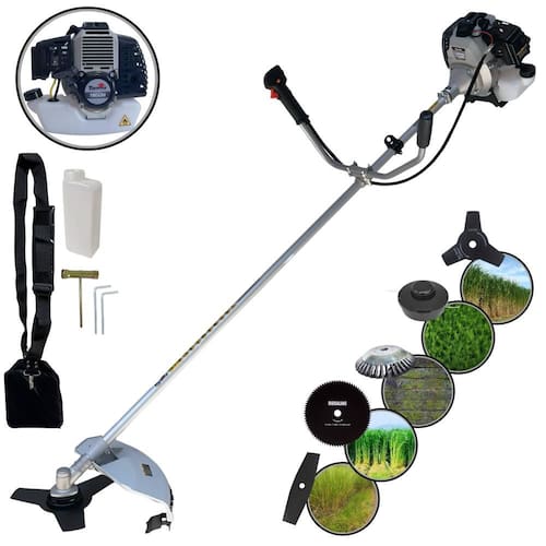 Com guidão ergonômico lateral, permite um alcance amplo e maior mobilidade, capaz de aumentar a produtividade diária. Possui motor 2 tempos á gasolina, de 42,7 Cilindradas, 12.000 de rotação 1,7HP de potência que proporcionam maior performance e economia na operação. Seu conjunto de acessórios inclui kit de ferramentas, cinto de suporte almofadado, carretel de nylon e lâmina de corte 3 pontas.