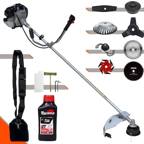 Roçadeira À Gasolina Toyama TBC43H 42,7cc 1,7HP 12.000rpm 2T + Faca 2 Pontas 330mm + Faca 40 Dentes 255mm + Faca 80 Dentes 255mm + Faca 6 Pontas 250mm + Trimmer + Escova Rotativa 200mm 38 Cerdas + Óleo Toyama FG50 500ml