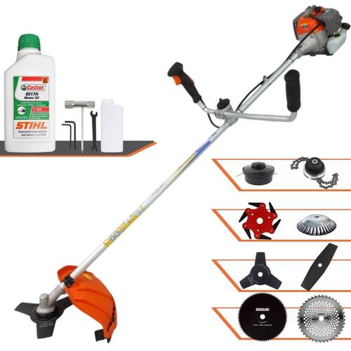 Roçadeira Lateral Vulcan VR330P À Gasolina 33cc 1,2HP + Facas 2 Pontas; 40 Dentes; 80 Dentes; 6 Pontas; Trimmer + Escova 38 Cerdas + Óleo Sthil