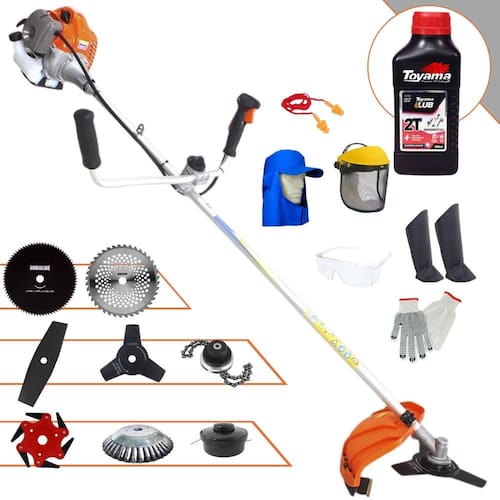 Roçadeira Lateral Vulcan VR430P À Gasolina 2 Tempos 43cc 1,7HP + Faca 2 Pontas 330mm + Faca 40 Dentes 255mm + Faca 80 Dentes 255mm + Faca 6 Pontas 250mm + Trimmer + Escova Rotativa 200mm 38 Cerdas + Óleo Toyama FG50 500ml + KIT EPI
