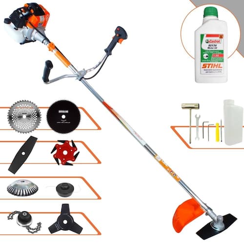 Roçadeira Lateral Vulcan VR430S À Gasolina 2 Tempos 43cc 1,7HP + Faca 3 Pontas 255mm + Faca 40 Dentes 255mm + Faca 3 Pontas 250mm + Faca 80 Dentes 255mm 2mm + Escova Rotativa  + Trimmer + Óleo CASTROL STIHL