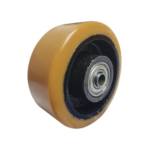 Roda com núcleo em ferro fundido e poliuretano moldado, equipada com mancal de rolamento esférico. Indicada para cargas leves e moderadas, é resistente a óleos, graxas, solventes, sais e produtos químicos.