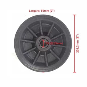 - Material Pneu: Borracha - Material Núcleo: PP Polipropileno - Diâmetro da roda: 8' ou 203,2mm - Diâmetro furo eixo: 7/8 ou 22,22mm - Capacidade de peso por roda: 80kg - Largura da Roda: 50mm Marca: Não Informado Ean: 1091001048336