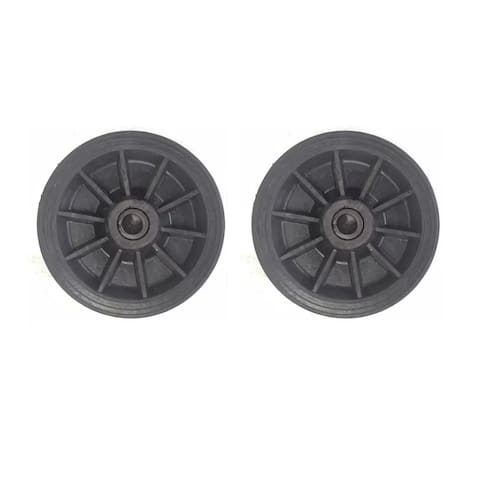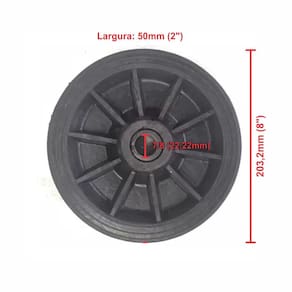 - Material Pneu: Borracha - Material Núcleo: PP (Polipropileno) - Diâmetro da roda: 9' ou 228,6mm - Diâmetro furo eixo: 7/8 ou 22,22mm - Capacidade de peso por roda: 120kg - Largura da Roda: 50mm
