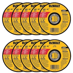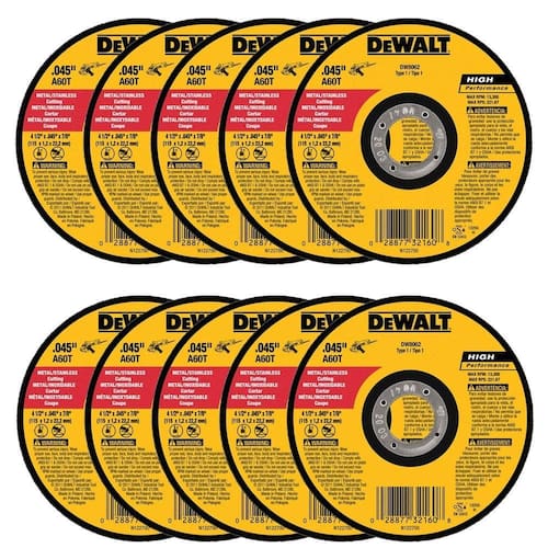 DeWalt DW8062 Rebarbadora angular de metal de 10 cm x 0,4 cm x 7/20.3 cm, pacote com 10 - Fino. Design de roda de 045 polegadas para corte rápido sem rebarbas, é fácil de usar - É altamente durável, fabricado na China - Combinação exclusiva de grãos de óxido de alumínio para ação de corte agressiva - A mistura de material patenteada garante rodas duráveis de longa duração 2 folhas completas de fibra de vidro para durabilidade e segurança - Conjunto de 10 de corte rápido sem rebarbas