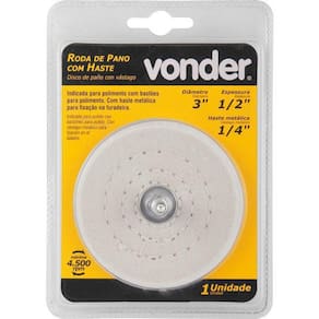 Roda de pano 3 c/haste vonder 3599033000 Conteúdo da embalagem: 1 roda de pano com haste Indicada para polimento com bastões para polimento. Utilizada em furadeiras. Com haste metálica para fixação na furadeira Diâmetro externo da roda com haste: 3 - 76 mm Espessura da roda com haste: 1/2 - 12,7 mm Diâmetro da haste da roda: 1/4 - 6,3 mm Rotação máxima rpm : 4500 /min - e cdc : legal: 90 dias Ean: 7893946161606