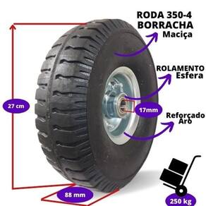 Roda Pneu Maciço Borracha 3.50-4 Eixo 17 Mm Rolamento Esfera - Schioppa Pneu maciço 3.50-4 schioppa, são amplamente utilizadas para carrinho de mão, carrinho de gramado, carrinho de mão, carrinho plataforma e outro,Borracha Maciça com Núcleo de Chapa Estampada. Dureza: 80 Shore A. (-20C a +70C). Produzidas com aro de borracha maciço, com núcleo em chapa estampada com acabamento zincado. São leves e resistentes, tem rodagem macia e silenciosa, e são indicadas para serviços leves em pisos em bom estado. A velocidade de trabalho indicada é até 4km/h. Suporta até 250kg.Sua Banda é em borracha montada sobre um núcleo de aço carbono galvanizado. Apresenta boa absorção de choques e eliminação de ruído. Apresentam as mesmas características das rodas pneumática, oferecendo custo benefício. pois, a manutenção é muito reduzida. Aconselhável para aplicações em diversos ambientes de trabalho, que necessitam absorção de vibrações e eliminação de ruídos. Possui rolamento tipo rolete, o que da maior leveza à tração mecânica seu cubo reforçado com nylon nas extremidades. Eixo soldado e bico para engraxamento.-Mais econômicas e ambiental corretas do que as rodas de borracha.-Bom em resiliência resistência-Macias, Leve e durável excelente rodagem-Resistente ao calor e ao frio.-Eliminação de ruído-Resistente à água, óleo, sujeira, ácido.Dados técnico:-Rolamento Esfera-Eixo soldado e bico para engraxamento.-Tamanhos representados na imagem.-Modelo: 3.50-4- Diâmetro: 27 Cm- Largura: 8,5 CM- Diâmetro Eixo: 17 mm- Tipo Rolamento: esfera 6003 Z- Comprimento eixo: 60 mm-Aro da roda: chapa zincada, reforçado com 4 parafs-Dureza: 80 shore A-Temperatura de Trabalho: -20 A 70C-Capacidade de carga: 250 kg cada roda, para garantir uma boa qualidade do produto e maior dia útil é aconselhável usar uma margem de segurança de 25%-Peso da roda: 4.750 kg-Indicada para superfícies de trabalho: concreto liso, asfalto, cerâmica, aço/metal, madeira.-Condições do ambiente de trabalho: vapor, óleo industrial, tração manual.