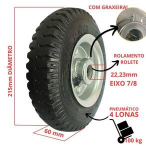Roda Pneumática Carrinho De Carga 250-4 Rolete 7/8 Pol. 100kg Roda Pneumática 250-4: Desempenho Robusto e Confiável para Carrinhos de CargaAs rodas pneumáticas 250-4, equipadas com câmera e pneu de 4 lonas, destacam-se em diversos cenários, como carrinhos de armazém, plataformas e carrinhos de carga. Seu aro em alumínio proporciona resistência excepcional contra corrosão, enquanto os rolamentos tipo rolete de 7/8 (22,23mm) asseguram uma capacidade de carga de até 100 kg por roda.Principais benefícios do pneu para carrinho de carga 250-4:Durabilidade com 4 lonas: Oferece resistência superior. Construção robusta: Fabricada com pneu, câmara de ar e núcleo estampado com solda, aço reforçado de 2mm. Manutenção simplificada: Inclui graxeira para facilitar lubrificação e cuidados. Desempenho reforçado: Rolamento rolete resistente. Movimentação suave: Proporciona uma experiência leve e suave. Aconselhável para uma variedade de ambientes de trabalho, especialmente em pisos irregulares, onde a facilidade de movimentação e a absorção de impactos e vibrações são essenciais.Dados Técnicos:Rolamento rolete eixo: 7/8 pol. (22,23mm) Diâmetro da roda: 8,5 (215mm) Largura do pneu: 60mm Modelo: 2.50-4 Altura do perfil: 45mm Comprimento do cubo: 57mm Diâmetro do cubo: 7/8 pol. (22,23mm) Aro da roda: Chapa de aço 2mm Capacidade de carga: 100kg por roda (recomenda-se uma margem de segurança de 25% para garantir qualidade e durabilidade) Peso da roda: 1.480kg Superfícies de trabalho recomendadas: Concreto liso, asfalto, cerâmica, aço/metal, madeira Marca: TOP OPÇÕES