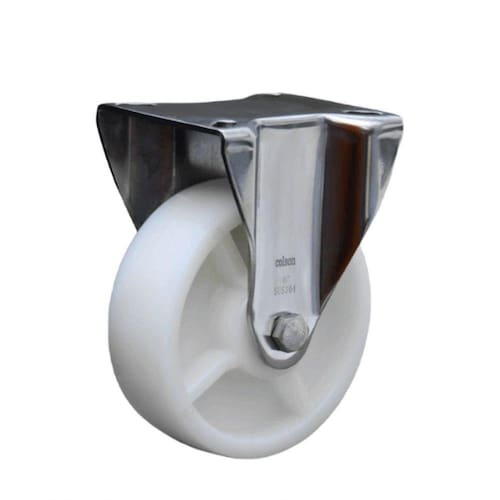 Rodizio industrial aço Inox fixo 8x2 pol. placa Sem freio Os Rodizio de maior durabilidade e resistente a maresia e outros produtos agressivos, são os em aço inox ou latão. A corrosão (oxidação) deriva do excesso de umidade, calor e de partículas de sal, através do contato químico ou eletroquímico num determinado meio de exposição, na maioria das vezes, a corrosão metálica está associada à exposição do metal num meio no qual existe a presença de moléculas de água, visto muito no litoral brasileiro, para solucionar este problema usa-se rodizio inoxidável. Aplicação: Reboque de lancha, reboque de barco, caretinha para lancha, caretinha de barco, litoral, praia, Roda Carreta de Encalhe. Roda: Em nylon 100% (poliamida 6), furo passante com tubo separador 1/2". Dureza 75 Shore D (-30C a 100C). Garfo: Em aço inox AISI 304 com dupla pista de esferas, pino mestre com parafuso reforçado, freio em inox. Características técnicas: Diâmetro da roda (pol): 8 polegadas 203,20 mm com freio: não Garfo em aço inox 304 roda em nylon Placa: 127x110mm Largura da banda da roda : 2" pol. ( 50,8 mm) Comprimento do cubo (mm): 62 mm Diâmetro do eixo: 1/2" - 12.7 mm Raio de giro do rodízio (mm): 150 mm Altura total (mm): 245 mm Capacidade de carga (kg): 800 kg Dureza: 75 shore Temperatura de trabalho: -30 a 100 Imagens meramente Ilustrativa. indicado: concreto liso, cerâmica, aço, metal, madeira, Proteção ao piso, trabalho silencioso, água, contato ocasionado com o vapor, cavacos metálico, óleo industrial, álcool, tração manual.