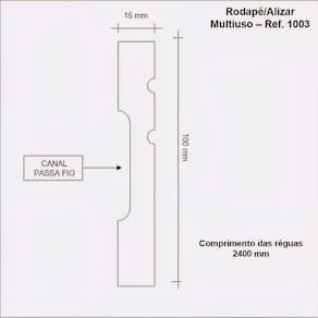 Rodapé revestido com melamina de alta resistência pronto para instalação, não necessita pintura. O Rodapé é desenvolvido em um material ecologicamente responsável e tecnicamente eficiente. O MDF é um padrão internacional de qualidade em ecologia e sustentabilidade, com inúmeras vantagens de aplicação.sem empenamento, mostra-se um material que entrega um Rodapé final de excelência. Não descolore, tonalidade do produto não se altera, devido o revestimento melaminico ser composto de vernizes de alta resistência a riscos, pigmentos e resinas de alta qualidade, o que garante um produto de sem oscilação de cor, independente do ambiente onde se encontra. Acabamento: Liso Acompanha Ficha Técnica: Sim Acompanha Manual de Instalação: Não Altura: 10 Ambientes Recomendados: Área Comercial/Área Residencial Complexidade da instalação: Baixa:pode ser montado por uma pessoa sozinha Composição: MDF Revestido com Melamina Comprimento: 240 Cor: Branco Cor: Branco Cor do Produto: Branco Cor Predominante: Branco Escala de Brilho: Semi-Brilho Espessura: 15 Imune a cupim: Não Indicações de Uso: Madeira e Vinílico Itens Inclusos: Régua Rodapé 2400x100x15 mm Linha ou Coleção: Tradicional Manual de Montagem e Instalação: https://product-hub-prd.madeiramadeira.com.br/moldufama%20new.pdf/documents/moldufama%20new.pdf Marca: Moldufama Material Principal: MDF Necessita Instalação: Sim Origem do Produto: Nacional Peso: 0.823 Possui friso: Sim Possui passa-fio: Sim Recomendações de Uso, Manutenção e Limpeza: Fácil limpeza, com pano úmido, álcool ou querosene. Resistência à Água: Não Resistência a umidade: Não Resistência ao Fogo: Não Tamanho: 10cm x 15mm x 2,40m Tipo de Acabamento Decorativo: Rodapés Tipo de Instalação: Colado Tom de cor: Médio Uso Indicado: Interno