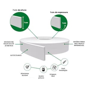 Rodapé ripado eva autocolante 7cm rp43 10 metros meurodapé Solução prática, economica e inovadora para deixar seu ambiente mais bonito, sofistidado e moderno, produzido em borracha e.V.A, material de alta durabilidade, flexivel, ecologico, não apodrece, não pega cupim,pode ser molhado e aceita qualquer tipo de pintura . Podendo ser instaldo como: rodapés, roda tetos, roda meios, boiseries, faixas, molduras ou como sua imaginação quiserAhhh... Se você gosta do faça você mesmo, vai adorar, pois é de facil instalação, já vem com fita dupla face, sem sujeira, não necessita cantoneiras e pode ser instalado em áreas internas e externasCaracterísticas gerais do produto: Dimensões axlxp (cm): 7 x 1 x 1000 Produzido em: borracha e.V.A Cor acabamento: branco fosco Garantia: 3 anos junto ao fabricante Aplicação: externo ou internoAcompanha o produto: 10 metros de rodapéGarantia: 3 anos junto ao fabricante Marca: Meurodapé