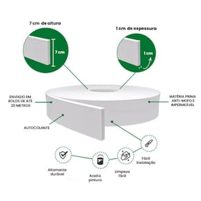 Dimensões axlxp cm : 7 x 1 x 1000 Produzido em: borracha e.V.A Cor acabamento: branco fosco Garantia: 3 anos junto ao fabricante Aplicação: externo ou interno
