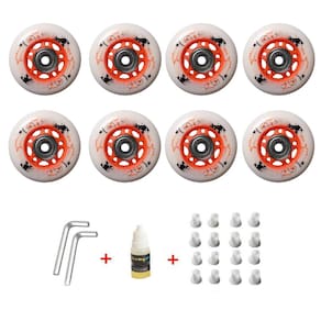 - 64 mm, 68 mm de diâmetro, 24 mm de espessura/rolamentos ABEC-9. As rodas de skate em linha são feitas de poliuretano de alta densidade resistente à abrasão.