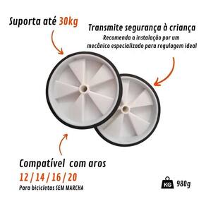 - Rodinha lateral regulável. - Reforçado, auxilia crianças no processo de aprendizagem de andar de bicicleta, transmitindo maior segurança. Compatível com bicicletas aro 12, 14, 16 e 20