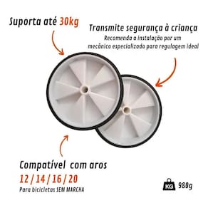 - Rodinha lateral regulável. - Reforçado, auxilia crianças no processo de aprendizagem de andar de bicicleta, transmitindo maior segurança. Compatível com bicicletas aro 12, 14, 16 e 20