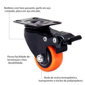 Essas rodinhas possuem um garfo em aço cromado e uma placa em aço zincado, o que garante uma maior resistência e durabilidade. A roda é feita de resina termoplástica transparente, com núcleo de polipropileno, o que proporciona uma baixa deformação mesmo com carga estática.