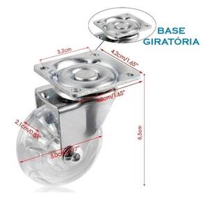 - Anti risco Não arranha nem Porcelanato - Sem trava - Material da Base: Aço - Material da Roda: Silicone Gel Anti risco Poliuretano - Altura total do Rodízio: 60mm ou 6cm - Diâmetro da Rodinha: 50mm ou 5cm - Espessura chapa 1,5mm - Tamanho da Chapa: 42mm 4,2cm x 42mm 4,2cm quadrado - Distância entre Furos: 32x32 - Capacidade Máxima: 50Kg por Rodízio - Cor da Roda: Transparente - Cor da Base: Cromado