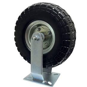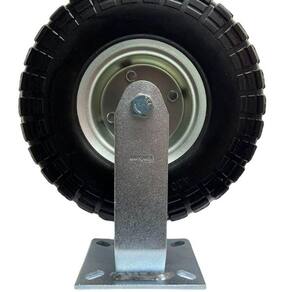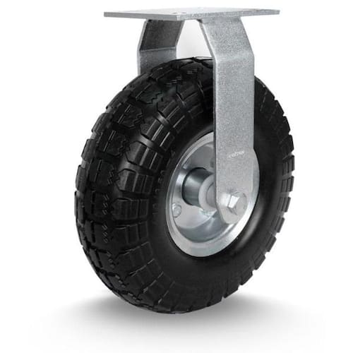 Rodizio 350-4 Maciço Fixo Eixo 7/8 Carga 150kg DIFERENCIAIS DO PRODUTO: Sua construção projeta uma vida útil prolongada, a manutenção é simples e cômoda, silencioso, reduz ruídos e vibrações, preserva a carga.APLICAÇÃO: Aconselhável para aplicações diversas que necessitem de boa absorção de vibrações e eliminação de ruídos. COMPOSIÇÃO: Roda: Banda em PU Maciço (preto), aro em chapa 1,5 mm (zincado) com bucha e nylon e rolamento de roletes 7/8, não possuem bico graxeira. Dureza 90 Shore A (-20C a 70C). Garfo: Suporte em aço com 5 mm de espessura, dupla pista de esferas e acabamento zincado branco. Construção do pino central montado com parafuso reforçando a união do conjunto giratório, com a vedação das pistas contra pó/poeira e bico graxeira para manutenção. Capacidade de carga 150kg.