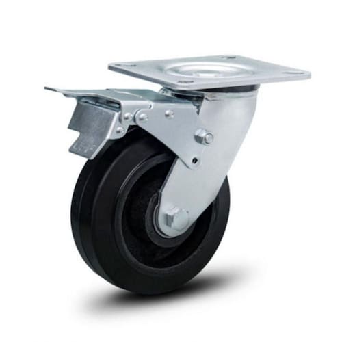 O Rodizio Giratório industrial 6X2 Polegadas serie MR Colson, é indicado para diverso, industrias, pequenos pórticos, gruas e girafa, guincho hidráulico, conta com uma estrutura reforçada com grafo em 5 mm de espessura e com soldas internas e externa nas pernas. O diferencial deste Rodizio é o pino central que possui paraf reforçado, na união entre a placa e o conjunto giratório. Para facilitar a manutenção do Rodizio o que prolonga a vida útil do conjunto, A pista possui um bico de graxeira o que deixa mais simples e cômoda o engraxamento das pistas, além de possuir vedação contra pó/poeira. Roda borracha: banda em borracha moldada (preta) de alta qualidade sobre núcleo de ferro fundido com duplo rolamento esferas 6203ZZ em 5 e 6 e 6204ZZ em 8 com manga de eixo de 1/2. Dureza 75 Shore A (-15C a 60C) Garfo: em aço baixo carbono com 5 mm de espessura e solda interna e externa nas pernas do garfo. Pino mestre com paraf reforçado, vedação das pistas contra pó/poeira. Pedal de freio em aço com dupla ação on / off Características técnicas: Diâmetro da roda (pol): 6 Polegadas - 152,4 mm Placa giratória: 130 X 140 MM Com freio: SIM Largura da banda da roda : 2 polegadas 50,80 mm Comprimento do cubo (mm): 11 mm Raio de giro do rodízio (mm): 136mm Altura total (mm): 197 mm Capacidade de carga (kg): 350 kg Dureza: 75 shore Material: borracha Temperatura de trabalho: -15 a 6 Cor: Amarelo indicado: concreto liso, asfalto, cerâmica, aço, metal, madeira, Proteção ao piso, trabalho silencioso, água, contato ocasionado com o vapor, óleo industrial, tração manual.
