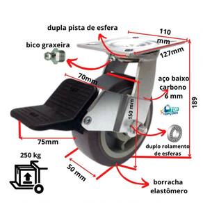Também conta com facilidade e conforto nas manobras manuais contribuído na redução do esforço físico do operador.Indicada para cargas médias de até 250 kg, respeitando uma margem de segurança de 25%, oferece vantagens no uso de uma mesma roda para diferentes tipos de pisos: macio e duro.Composição da RodaBanda: Borracha elastômero (cinza). Dureza: 90 Shore A (-40C a 50C) Núcleo: De polipropileno de alta resistência, com duplo rolamento de esferas 6202ZZ 15mm e bucha separadora para a redução do eixo para 1/2Especificação técnica: