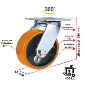 Rodizio Carga Pesada Giratório 5 Pol. S/ Freio 400 Kg Rodizio industrial 5 polegadas com rodas de ferro fundido revestida com poliuretano amarelo, resistente a abrasão, ideal para pisos liso ou áspero, movimentação cargas pesadas e levem macia fácil manobra, pois, conta com duplo rolamento de esfera, garfo com sistema de graxeira o que auxilia na manutenção do rodizio.Garfo: aço carbono 5 mm, com graxeira.Roda: fabricada com poliuretano de alta qualidade com o núcleo em ferro fundido, com duplo rolamento de esfera nas extremidadesCaracterísticas técnicas:Diâmetro da roda (pol): 5 Polegadas - 125 mmPlaca giratória: 110 X 130 MMCom freio: nãoLargura da banda da roda : 2 polegadas 50 mmComprimento do cubo (mm): 60 mmAltura total (mm): 164 mmCapacidade de carga (kg): 400 kgDureza: 95 shoreMaterial: PU - PoliuretanoTemperatura de trabalho: -20 a 70Cor: AmareloIndicado: concreto liso, asfáltico, metálico, cerâmica, madeira, proteção piso, tração manual.