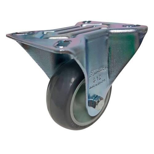 O Rodízio Fixo linha leve FLR 312 BP é fabricado em chapa de aço estampado e zincado e conta com placa de fixação. Projetado para cargas leves e moderadas com tração manual.