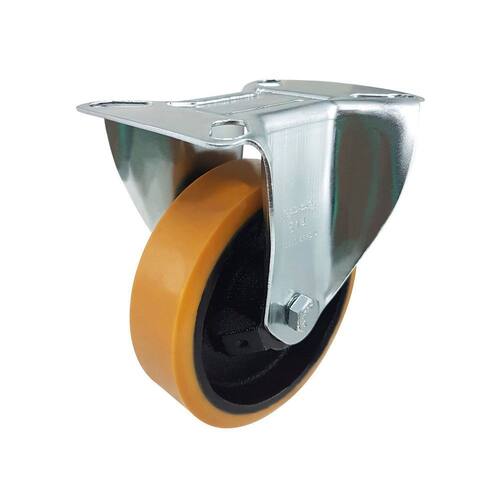 A roda é fabricada com revestimento de poliuretano moldado, núcleo em ferro fundido e mancal com rolamento esférico. Além disso, a roda é resistente a óleos, graxas, solventes, sais e produtos químicos.