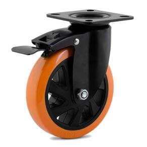 Rodizio Giratório 5 Pol. Placa C/ Freio Rolamento Glpbf.414.pu.e Rodízios em aço com dupla pista de esferas e acabamento em pintura epoxi preto com rodas de design inovador, com núcleo e banda em polipropileno ou núcleo de polipropileno e banda em poliuretano, com duplo rolamento de esferas de precisão.Características técnicas:Diâmetro da roda (pol): 5 polegadas 125 mmPlaca giratória: 113 X 100 MMCom freio: SIMLargura da banda da roda : 1.1/2"Comprimento do cubo (mm): 49 mmTipo de rodagem: Esferas: 10 mmRaio de giro do rodízio (mm): 130 mmAltura total (mm): 163 mmCapacidade de carga (kg): 170 kgDureza: 95 shoreMaterial: PU - PoliuretanoTemperatura de trabalho: -20 a 70indicado: concreto liso, asfalto, cerâmica, aço, metal, madeira, Proteção ao piso, trabalho silencioso, água, contato ocasionado com o vapor, óleo industrial, tração manual.