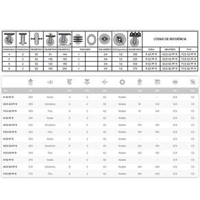 A rodagem do rodízio é do tipo rolete, com um rolamento de rolete galvanizado montado em uma gaiola de polipropileno ou metálica. Isso proporciona uma maior resistência à oxidação e um bom funcionamento.