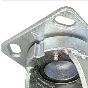 Os rodízios carga pesada 8x3 Kingpinless sem pino mestre são muito comuns em ambientes industriais e de manuseio de materiais. Como o nome indica, não há pino mestre central na placa, sem o pino mestre, remove completamente a causa n 1 de falha do rodizio. Com uma pista sem pino mestre, os rolamentos de esferas são protegidos pelas pistas interna e externa, portanto, não há pino mestre para falhar. Assim a carga de peso é distribuída uniformemente pela placa superior, oferecendo um giro suave. Se você precisar de rodízios para reboque, os rodízios sem pino mestre devem ser sua opção padrão inicial para aplicações rigorosas. Os rodízios Kingpinless custam mais, mas duram 2 a 3 vezes mais do que um lançador com pino mestre.