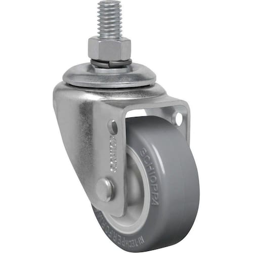 Rodízio giratório com espiga 2 pol. 50mm gle 210 bp suporta até 40kg - schioppa - Roda bp - composto termoplástico com pvc. Dureza: 85 shore a. -10ºc a +50ºc . Produzidas com revestimento em composto termoplástico com pvc e núcleo em polipropileno copolímero recicláveis. Proporcionam rodagem silenciosa, ótima proteção ao piso, excelente resistência química, boa resistência ao desgaste E aos impactos, resultando em ótima relação custo/benefício. A velocidade de trabalho indicada é até 4km/h. Suporta até 60kg cada rodizio Características gerais do produto: Tamanho: 10x10x10cm 0,1kg : 3 meses Marca: Não Informado Ean: 7892528061006