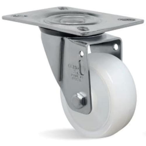 Rodizio giratório nylon 10cm 170kg gl 412 ntt - schioppa - Roda ntt - nylon técnico. Dureza: 75 shore d. -40ºc a +110ºc . Produzida em injeção única com poliamida 6 nylon de alta qualidade. É leve, possui ótima resistência mecânica, roda com muita facilidade exigindo menor esforço para manobras e movimentação, não deforma sob carga estática. Ideal para aplicações em ambientes úmidos é resistente a graxas, óleos, sais e alguns tipos de ácidos. Fabricada com material reciclável. A velocidade de trabalho indicada é até 4 km/h. Peso suportado: 170 kg Características gerais do produto: Tamanho: 10 x 3,2 x 10 350g : 3 meses
