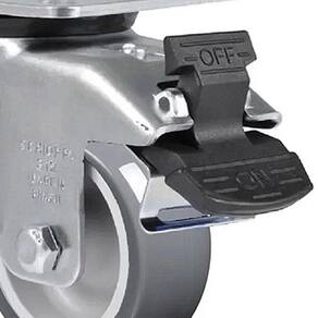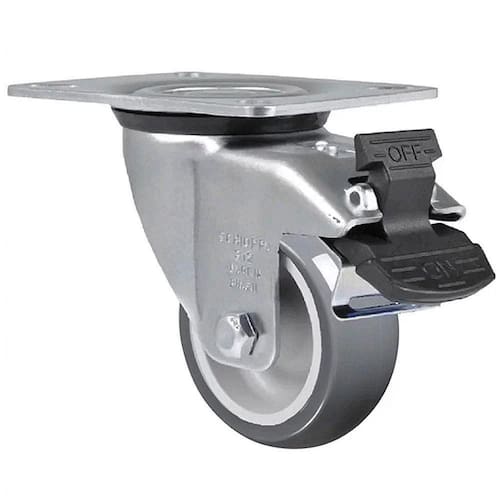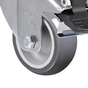 Possui o eixo da roda rebitado e proporciona rodagem macia e silenciosa, ótima proteção ao piso, excelente resistência química e boa resistência ao desgaste e aos impactos.