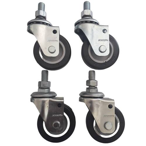 Garfo fabricado em chapa estampada e cabeçote com dupla pista de , acabamento zincado. Eixo da roda parafusado, roda 50 mm bp composto termoplástico com pvc. Dureza 85 shore a. -10ºc a +50ºc . Produzidas com revestimento em composto termoplástico com pvc e núcleo em polipropileno copolímero recicláveis. Proporcionam rodagem silenciosa, ótima proteção ao piso, excelente resistência química, boa resistência ao desgaste e aos impactos, resultando em ótima relação custo/benefício. A velocidade de trabalho indicada é até 4km/h 4 rodizios giratórios fixação parafuso roscado 3/8 x 25 mm altura rodízio 62 mm capacidade carga por rodízio 40 kgs eixo furo passante sem rolamento garantia 3 meses defeito fabricação Marca: Movifacil
