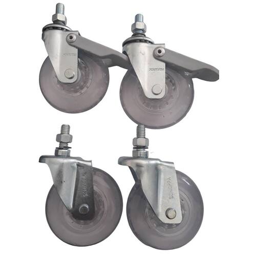 Garfo fabricado em chapa estampada e cabeçote com uma pista de , acabamento zincado. Eixo da roda rebitado, roda 75 mm colorgel, composto termoplástico com pvc transparente. Dureza 90 shore a 10ºc a +50ºc injetada com revestimento em composto termoplástico com pvc transparente em diversas cores e núcleo em acrílico. Ideal para móveis, gira com muita facilidade, requerendo pouco esforço para movimentação. Não deforma sob carga estática, apresenta boa resistência química e a impactos moderados. Produzida com material reciclável 2 rodizios giratórios com freio e 2 rodizios fixos fixação parafuso roscado 3/8 x 25 mm altura rodízio 98 mm capacidade carga por rodízio 50 kgs eixo furo passante sem rolamento freio pedal acionamento simples trava somente a roda garantia 3 meses defeito fabricação Marca: Movifacil