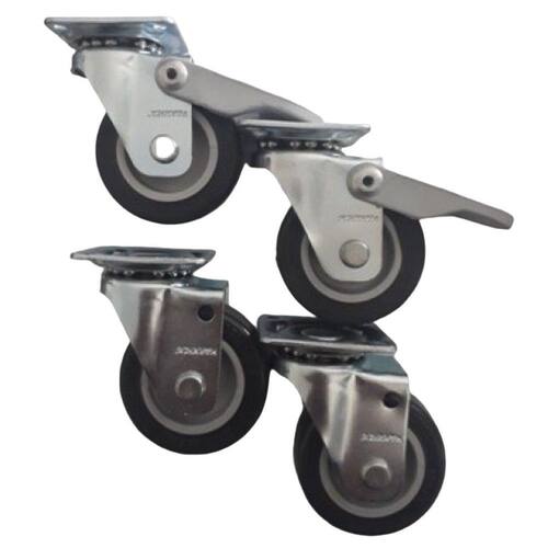 Garfo fabricado em chapa estampada e cabeçote com dupla pista de , acabamento zincado. Eixo da roda parafusado, roda 50 mm bp composto termoplástico com pvc. Dureza: 85 shore a. -10ºc a +50ºc . Produzidas com revestimento em composto termoplástico com pvc e núcleo em polipropileno copolímero recicláveis. Proporcionam rodagem silenciosa, ótima proteção ao piso, excelente resistência química, boa resistência ao desgaste e aos impactos, resultando em ótima relação custo/benefício. A velocidade de trabalho indicada é até 4km/h 02 rodizios giratórios com freio 02 rodizios giratórios sem freio fixação placa quadrada 4 furos medidas 42 x 42 mm entre furos 32 x 32 mm altura rodízio 65 mm capacidade carga por rodízio 40 kgs eixo furo passante sem rolamento freio pedal acionamento simples trava somente a roda garantia 3 meses defeito fabricação Marca: Movifacil