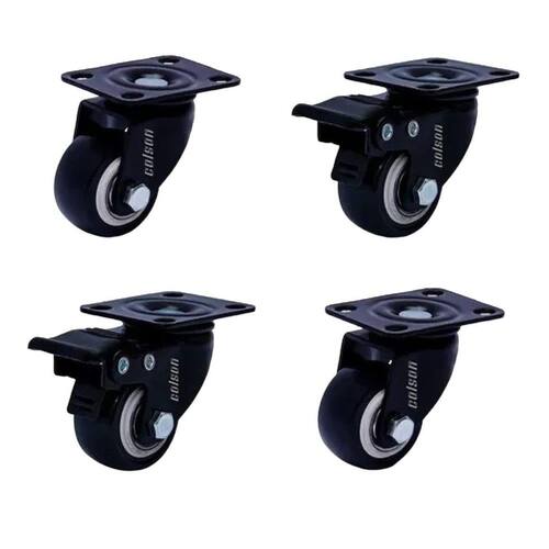 Em aço com acabamento epóxi preto resiste a corrosão, apresenta boa mobilidade, baixo ruído, maciez, conforto e não marca o piso roda 50 mm com duplo rolamento de de precisão, núcleo em polipropileno branco e banda de pvc bp preto . Dureza 75 shore a -10c a 50c . Kit sendo 2 rodizios giratórios com freio dupla ação trava a roda e o giro da placa e 2 rodizios giratórios sem freio, fixação placa retangular 4 furos, medidas 70 x 50 mm entre furos 50 x 35 mm, altura rodízio 74 mm, capacidade carga por rodízio 50 kgs, eixo duplo rolamento de , garantia 3 meses defeito fabricação Marca: Movifacil