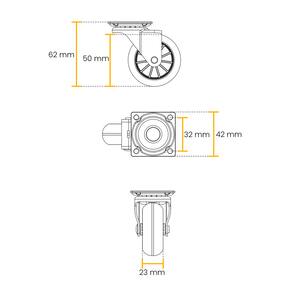 Altura total: 62 mm Altura até o suporte: 50 mm Dimensão da placa: 42 mm x 42 mm Distância entre furos: 32 mm Largura da roda: 23 mm