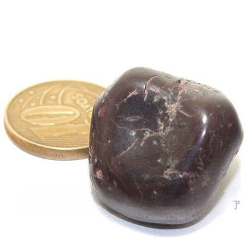 A Rodolita Granada, pedra rolada natural de garimpo, 22mm e 20g, ativa poderes místicos, elevando a espiritualidade e equilíbrio interior.