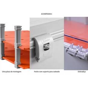 Sistema de suporte em até quatro níveis, presos por encaixe. Altura regulável conforme a necessidade e tamanho dos componentes.