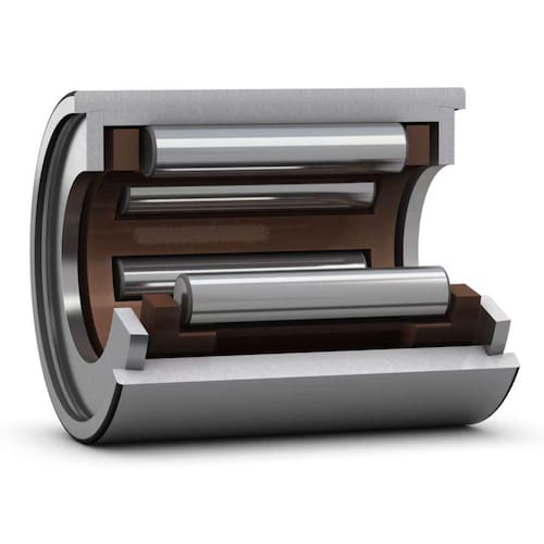 Os rolamentos de rolos de agulhas de uma carreira sem anel interno consistem em um anel externo com um conjunto de gaiola e rolos de agulhas. Eles são uma excelente escolha para arranjos de rolamentos compactos em aplicações onde pistas temperadas e retificadas podem ser fornecidas no eixo. O anel externo inclui dois anéis de fechamento não separáveis que atuam como flanges para guiar o rolamento axialmente.