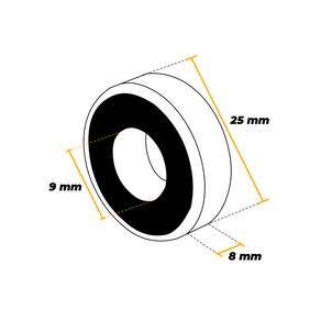Diâmetro do furo: 9 mm Diâmetro total do rolamento: 25 mm Espessura total: 8 mm